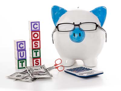 debt management - piggy bank with calculator and scissors with blocks spelling out cut costs